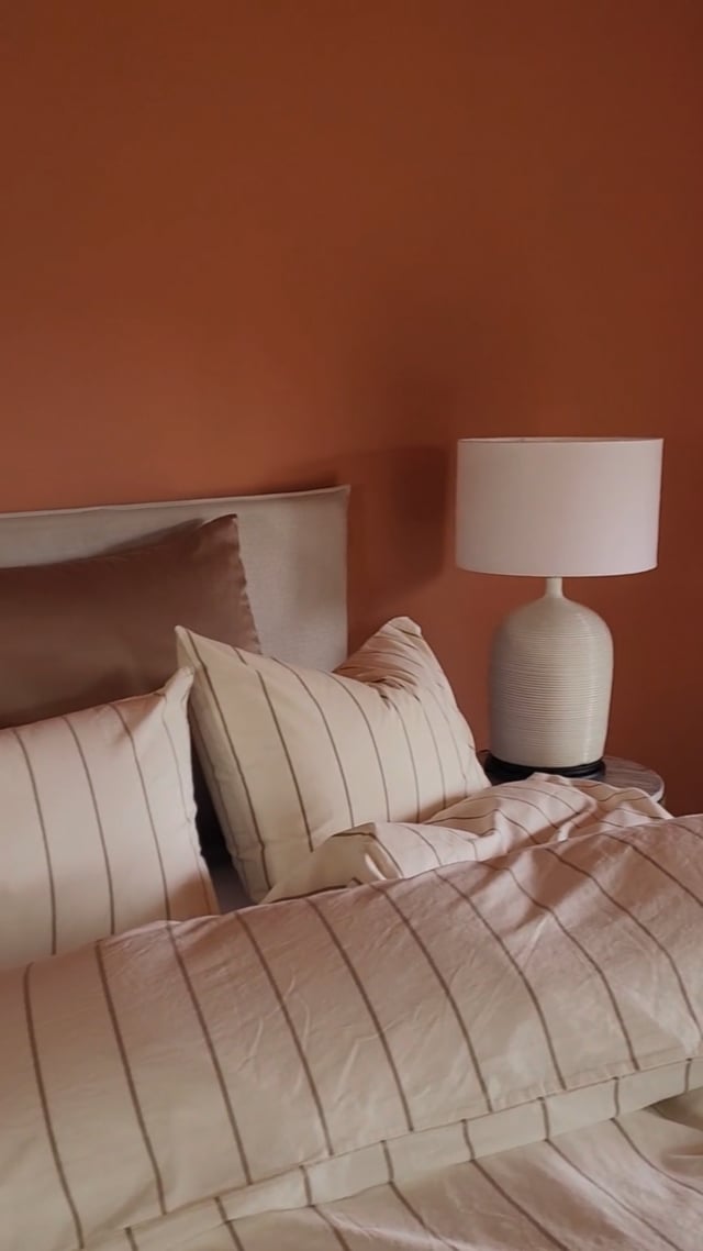 Royan sengesett i 100 % bomull har en lys beige bunnfarge, med smale brune striper og praktiske knapper som lukking. Den stilrene fargen og de diskrete stripene skaper en rolig og harmonisk atmosfære i sengen, ideell for deg som setter pris på enkelhet og varme på soverommet.